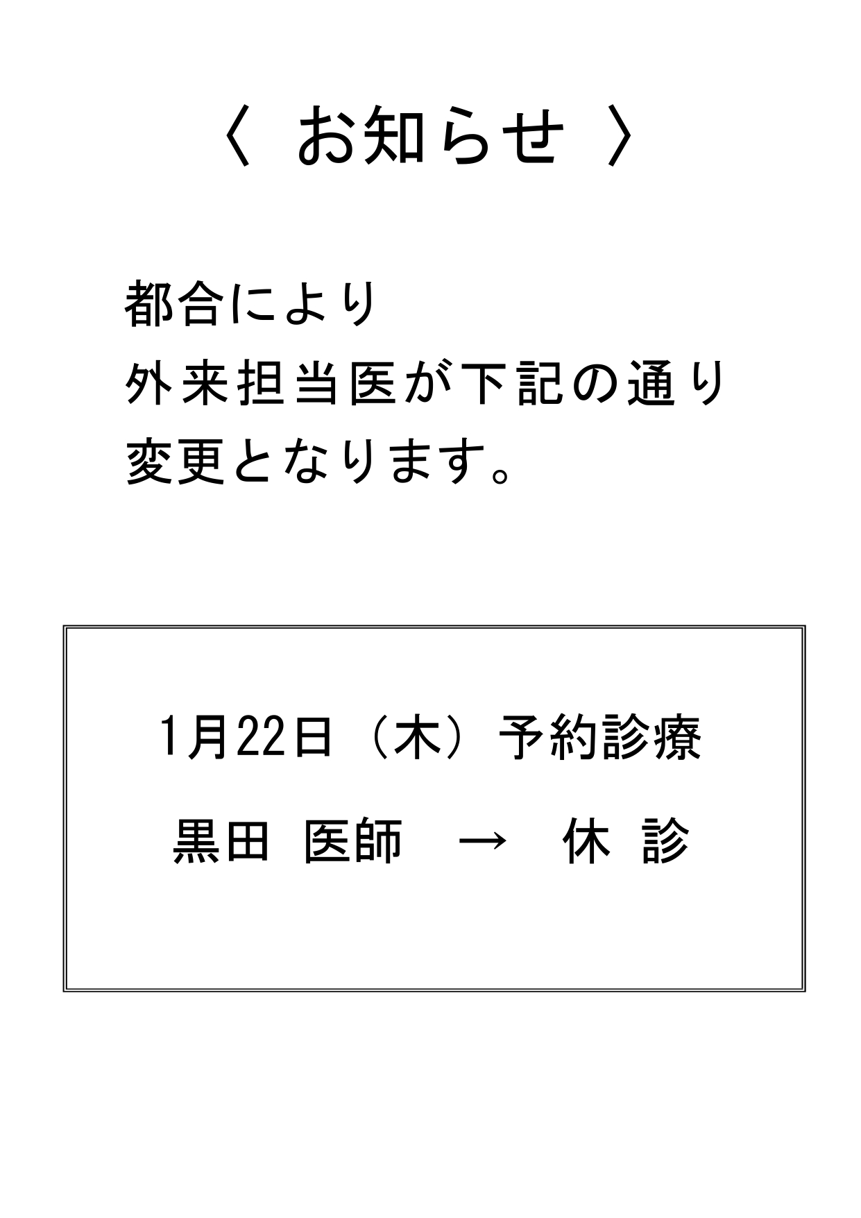 Home >  お知らせ >  外来診察担当医 診療変更のお知らせ(1/22)