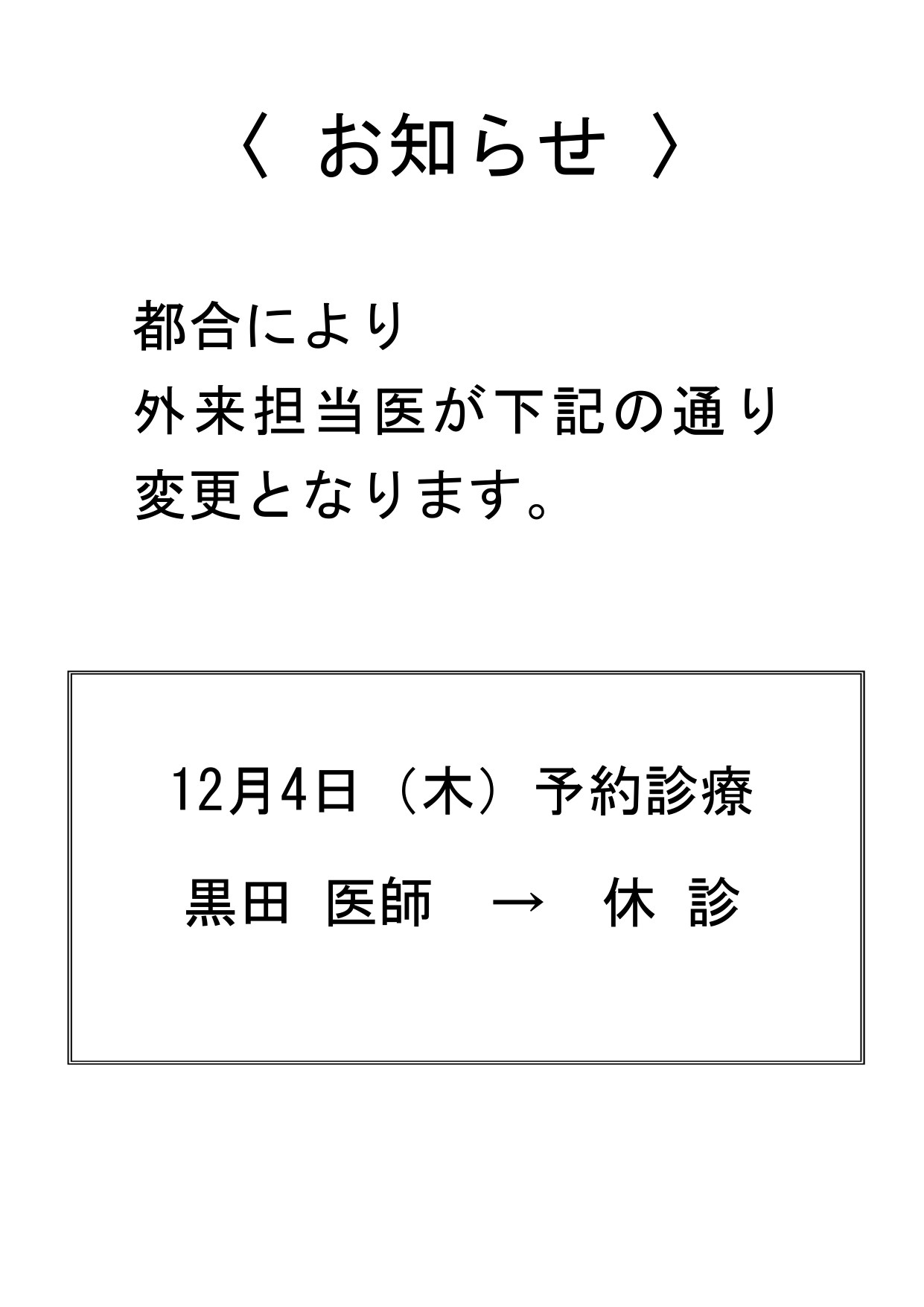 外来診察担当医 診療変更のお知らせ(12/4)