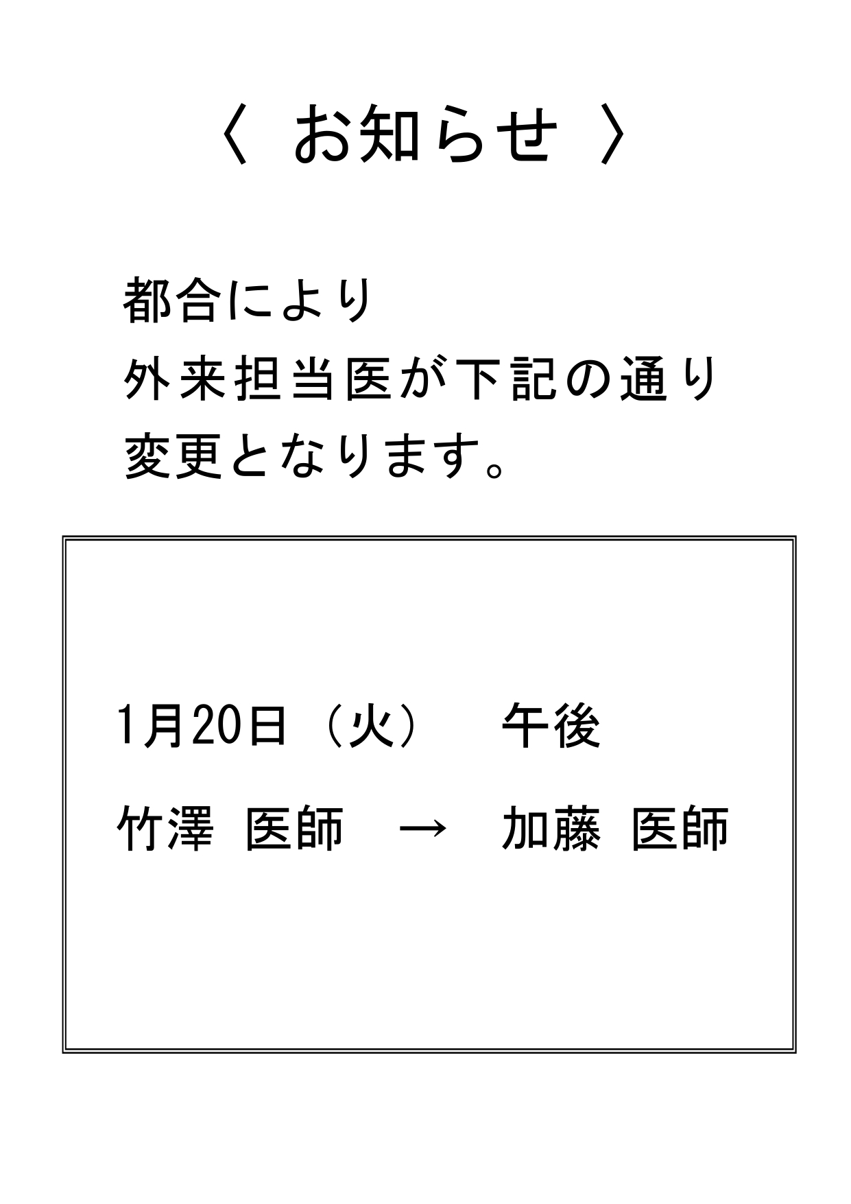 Home >  お知らせ >  外来診察担当医 診療変更のお知らせ(1/20)