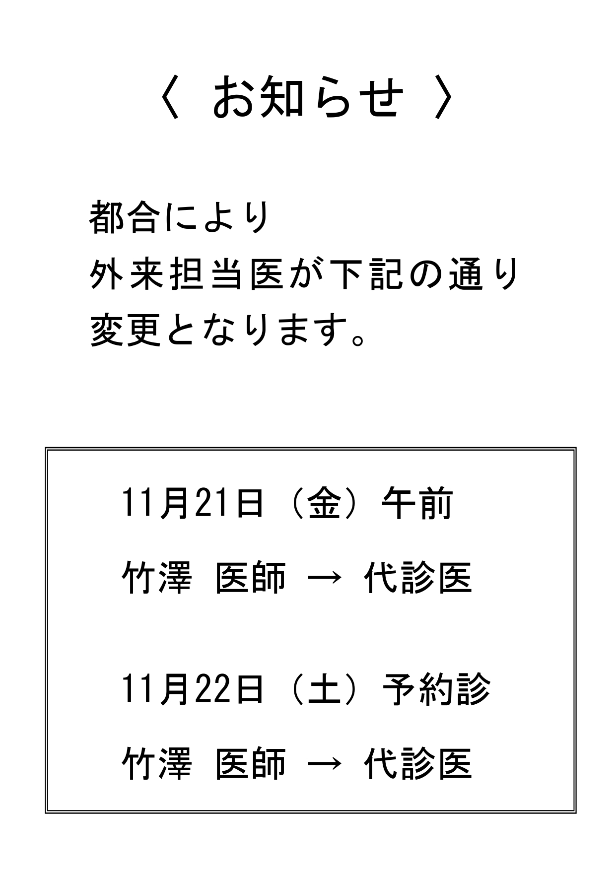 外来診察担当医 診療変更のお知らせ(11/21,22)