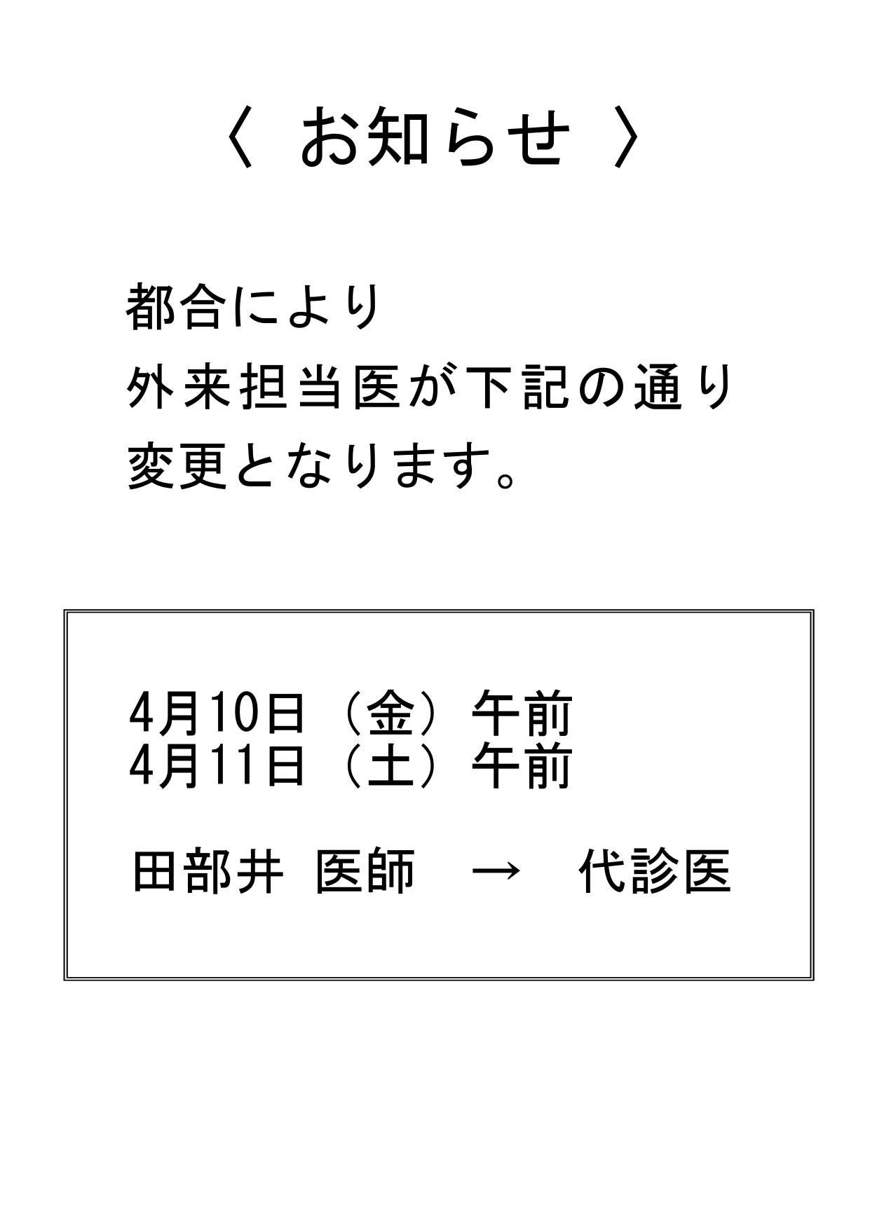 外来診察担当医 診療変更のお知らせ(4/10.11)